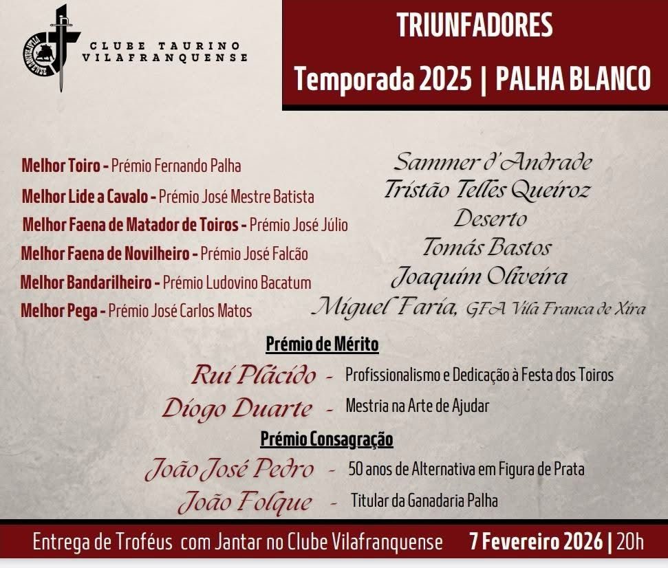 O Clube Taurino Vilafranquense deu a conhecer, os seus triunfadores da temporada de 2025 na Praça de Touros Palha Blanco. Na avaliação dos seus associados, o prémio de melhor toiro foi atribuído à ganadaria Sommer d’Andrade, enquanto Tristão Telles Queíroz foi distinguido como o melhor cavaleiro da temporada. Tomás Bastos recebeu o troféu de melhor […]