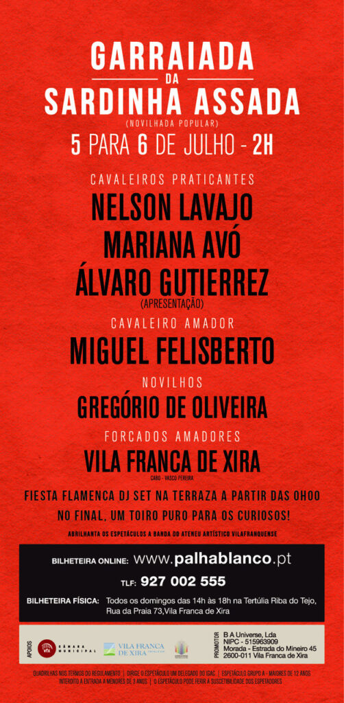 No sábado, dia grande desta festa de homenagem ao campino, espera de toiros seguida de largada pelas 18h30 e à noite as portas voltam a abrir pelas 00h para aquela que é a noite mais animada do ano na Palha Blanco, a da Garraiada da Sardinha Assada!